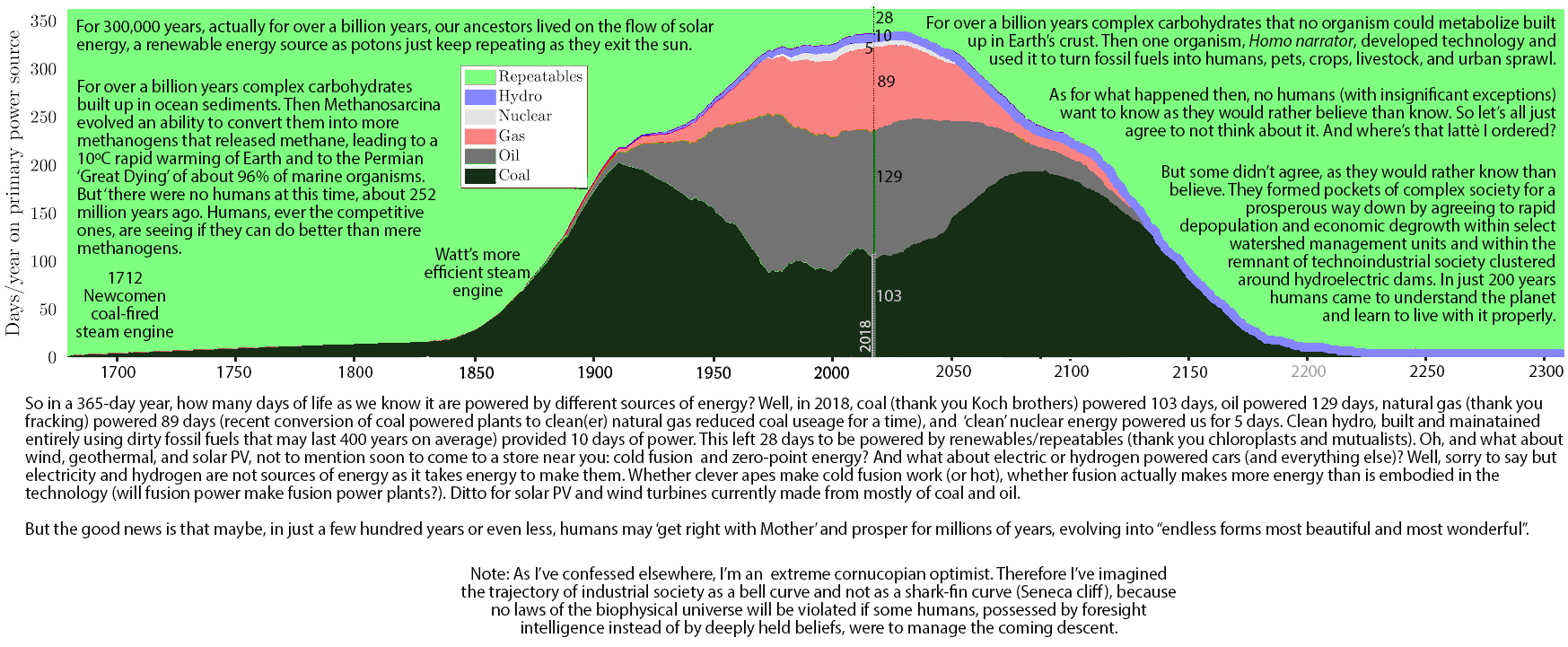 Note that while we will transition to 100% renewable/repeatable energy, by choice or otherwise, the amount of energy available during the fossil-fueled pulse will not be available. 'Alternative' energy is not alternative in kWh. Below, same graph with different y-axis, also bell-shaped and optimistic, perhaps too optimistic as peak energy as shown is high and descent could be a shark-fin cliff.