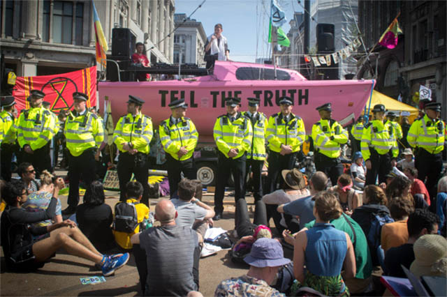 10/16/19 end of day 9, XR Unchained 9: 'Lawyers acting on behalf of Extinction Rebellion submitted a request for an urgent Judicial review at the High Court, challenging the Metropolitan Police’s blanket ban of Extinction Rebellion peaceful protests across the whole of London for the rest of the week.'
