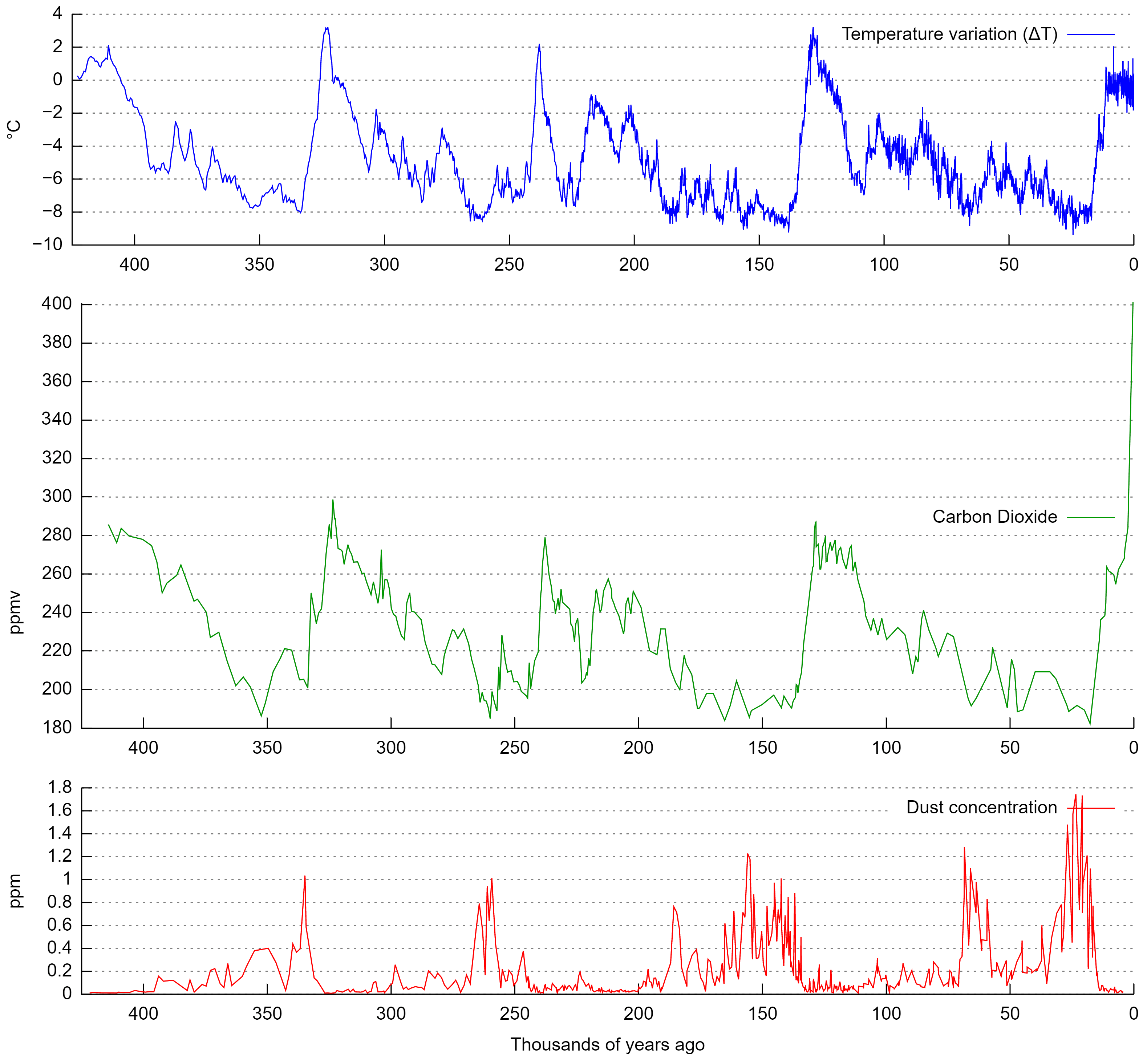 Temperature/CO2/dust changes in the past 400,000 years did not cause mass extinction events. Yes, by 2050 to 2100 anthropogenic climate change will be a significant driver of extinction. We Euro-Sinoans and Anthropocene enthusiasts, however, are the current cause. Of all mammals on the planet, 4 percent by mass are wild, and climate change isn't the cause. I protest the human sprawl I am entirely part of. I have spent my life as a servant of the SYSTEM, just not as enthusiastic nor as 'rewarded' as some. Whether future averaged temperatures increase or decrease (eventually warming will induce cooling) enough to significantly (>5%) add to the current mass extinction event (climate change will have to compete with the other anthropogenic drivers) remains to be seen. Expect that it will be significant, but to cite climate change as the number one threat to humanity and the biosphere is a distraction, which tactically may be the best the intelligentsia can do, but there will be competing narratives that feel ever so much better to believe. Climate change is one head of the hydra, the only one most can see with their blinders (political beliefs) on, and sleighing it will not change our trajectory.
