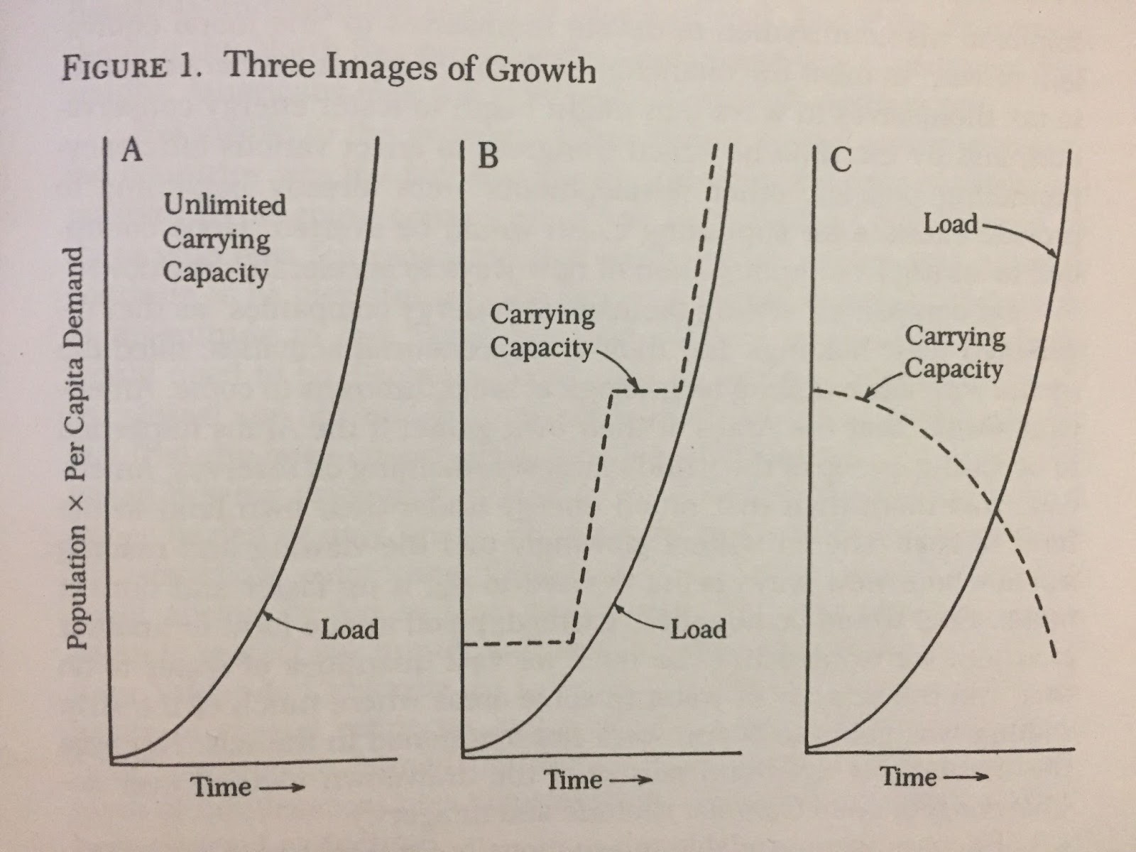 a post-exuberant world, however, sees carrying capacity diminishing over time as humanresource needs expand and technology serves to reduce capacity further (see Figure 1, C)