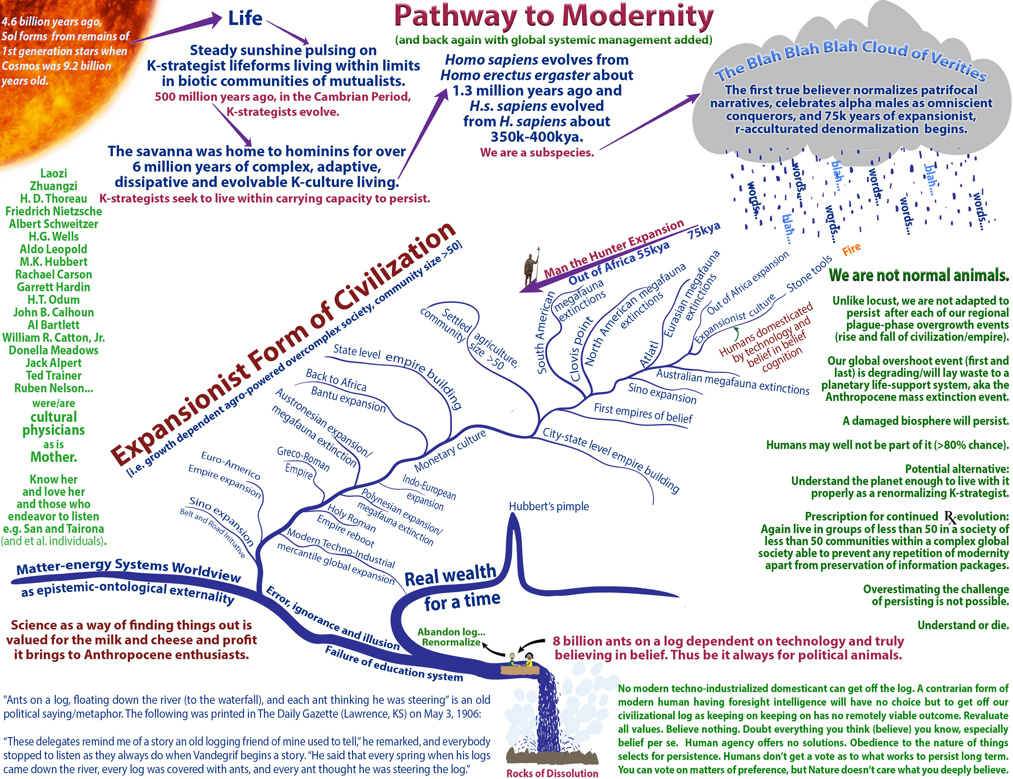 What if we are all a bunch of ants on 195 sovereign logs (some big, some small) in a rushing river bumping up against each other, and we think that if we put the right ants in power that they will steer our log the way we want it to go (via "change we can believe in" that will "make our log great again")? What if those who claim they are steering our log (who may actually believe they are) are not? What if almost everything we think we know is error floating on a river of ignorance in a thick fog of illusion (i.e. is belief-based assertion)? What if there is a waterfall ahead?