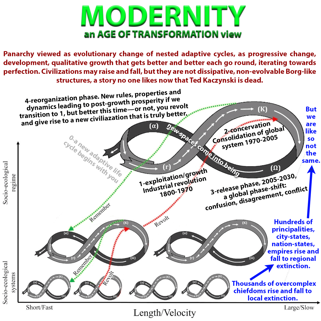 The panarchy story of a hierarchy of adaptive cycles evolving towards perfection is Pollyannaish. Long term, playing the overshoot and collapse game has no viable outcome, which is why K-strategists, for over 500 million years, have evolved to not play it (doing so tends to destroy/degrade the system the species is a dependent subsystem of). We expansionistic, obligate invasive species form of human have an expansionist r-culture that views living within limits as profoundly abnormal, a violation of natural law (MPP, the 4th law). Overexploiting an area and then moving on to a new one just over the horizon has worked for us for 50+k years, a SHORT TERM payoff.