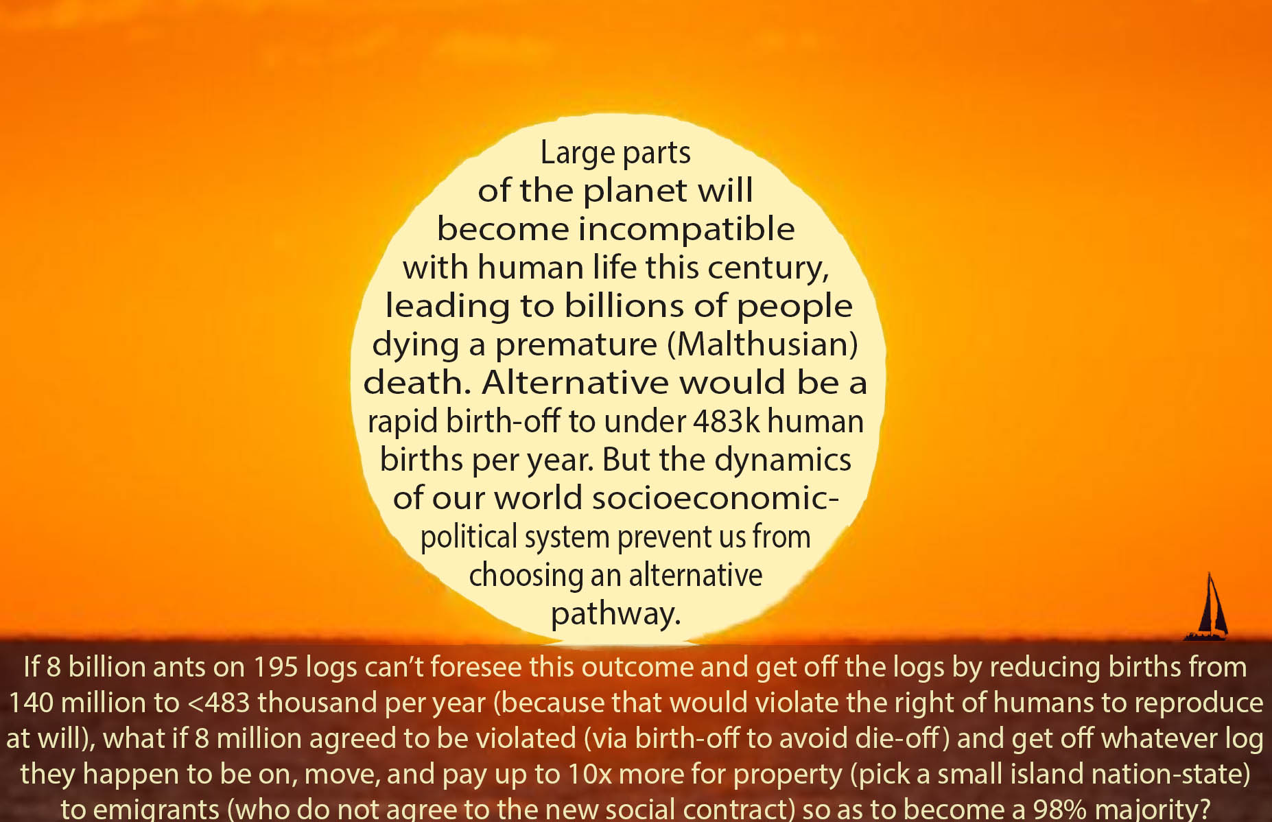 The human predicament is that each of the 8+ billion individuals on 195 logs, living by the current form of civilization’s rules of the game, are not using a matter-energy systems’ view that would select for a new social contract (new rules of the game), ones that explicitly sought to minimize injury potentials (e.g. of dying a Malthusian death).