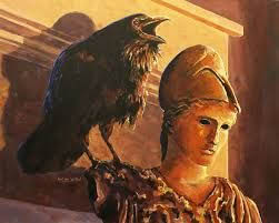 Open here I flung the shutter, when, with many a flirt and flutter, In there stepped a stately Raven of the saintly days of yore; Not the least obeisance made she; not a minute stopped or stayed she; Perhaps to escape the coming storm; perched above my chamber door— Perched upon a bust of Pallas Athena, wise bird, no fool—