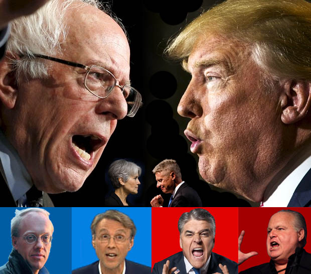 The two men are Donald Trump (or Rush Limbaugh or Sean Hannity) and Bernie Sanders (or Tom Hartmann or Chris Hedges). The man with a gun turns to you to ask, "So, Advisor, Sir or Madam as the case may be, should I take the high ground and not shoot anyone?"