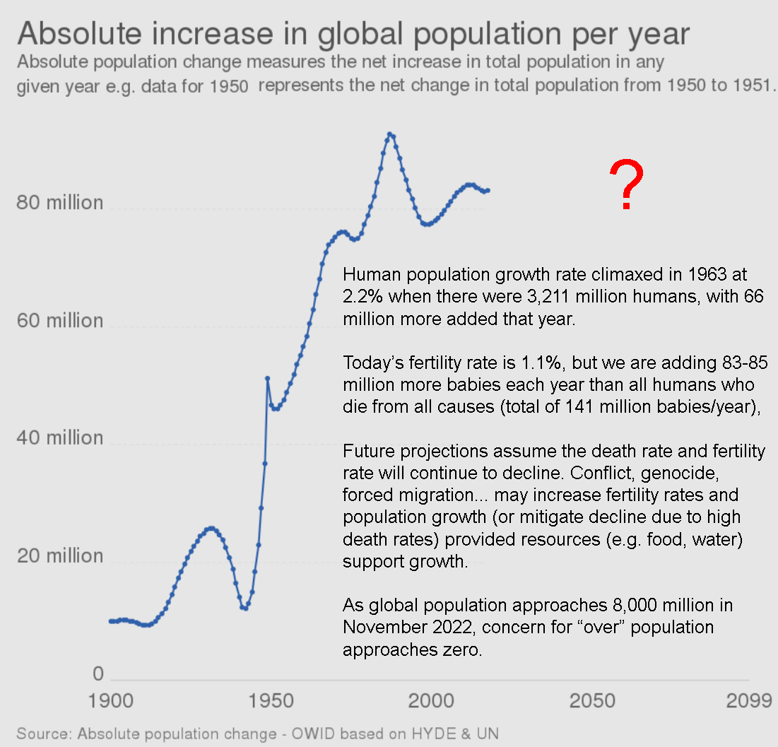 3) We cannot solve climate change or any other major symptom of overshoot (e.g., biodiversity loss, tropical deforestation, land/soil degradation, pollution of everything, etc.) in isolation. However, all symptoms would be alleviated simultaneously by addressing overshoot.