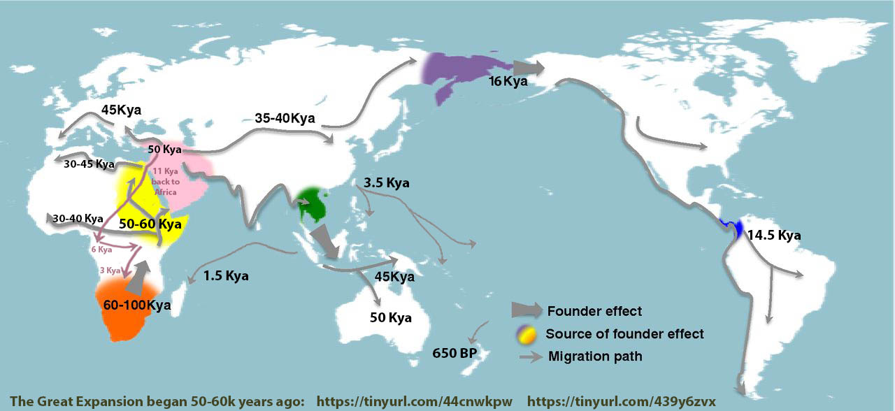 The Great Human Expansion of 50k to 60k years ago (beginning somewhere within Africa perhaps 75k years ago — the first 15k–25k years were not “great”— would be the origin, likely within one band of 20 to 50 pre-expansionist K-culture humans (a metastatic cancer begins with one wild cell before it is noticeable).