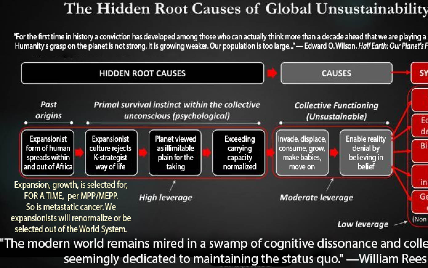 “…the hope that we can consciously and successfully undertake such a project in the 21st Century appears to be illusory for several reasons. First, as of today, there is no serious and organized effort dedicated to even exploring such a project, much less scoping it out. It simply is not on the agenda of any serious and substantial group. (The loose talk of a new “ecological civilization” is locked well within the MTI frames of reference.) Second, as of today, the capacity to undertake such work does not exist in an institution in the world. Worse, no institution aspires to develop capacities. No analogue of the Manhattan Project is being developed. Third, current research suggests we do not have even a century to get our act of evolutionary personal-to-civilizational adaptation together. In short, as of today, it is the case that as Bill Rees says, “We cannot alter long-standing patterns of either bio- or cultural evolution…”
