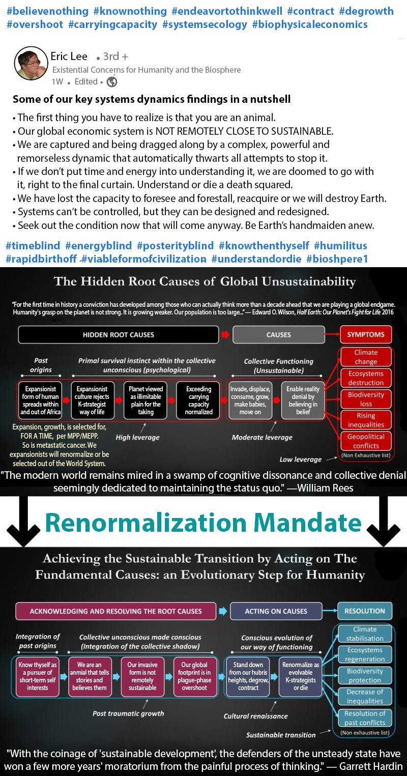 Of course, in an ideal world all these would happen. Today, none of the efforts directed to any of the above appear to be enough. [We MTIed ones are all products of the MTI Old Education system. We stopped running the race between education and catastrophe in the 20th century because the consensus narrative arose that we moderns won thanks to our clever ape exceptionalism and ability to decouple from nature resulting in the Great Acceleration. With climax and descent, more may become interested in the race, a teachable moment may cometh, and a coherent theory of revolution could yet arise and be acted upon. Those still living the purpose-driven live of making money and receiving social approbation for serving the MTI system, the monetary culture, may get a life-driven purpose to consider real solutions that might actually work to allow posterity to persist by loving and understanding the planet, i.e. learning to live with it properly as handmaidens anew.]