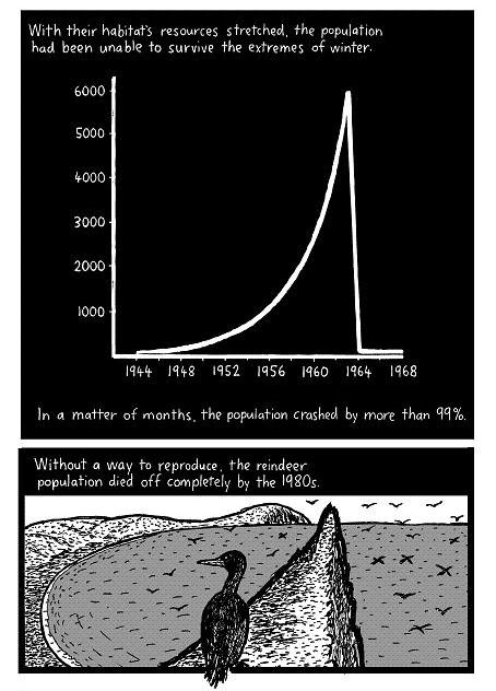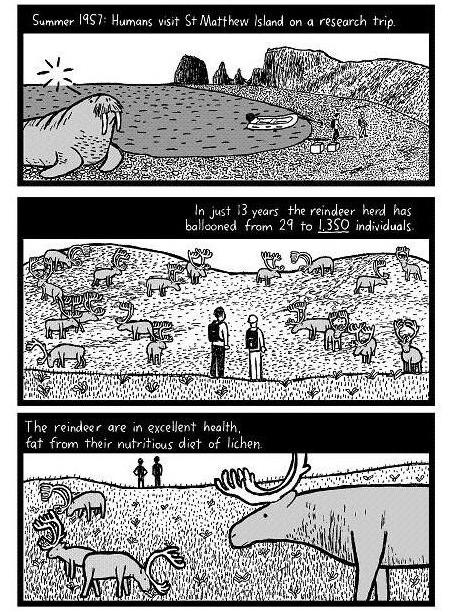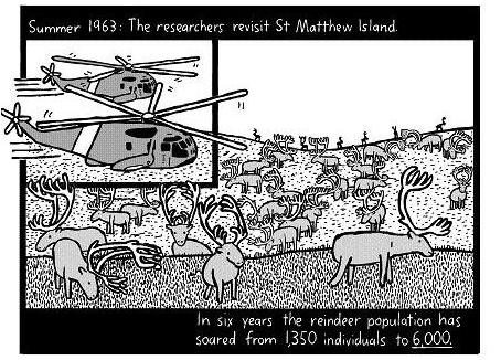 In 1963, scientists revisit St Matthew. In 6 years the reindeer population has exploded from 1350 to 6000 individuals.