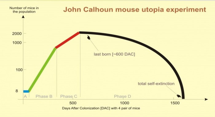 Population ecologist John B. Calhoun famously created mouse/rat Utopias which provided unlimited food, water, and nest materials. The only limit was space—kind of like an island paradise (or planet) so isolated that, should you ever want to leave, there's no place else to go. Even if there was a Planet B, colonizing it or deep space would just delay the reckoning slightly.