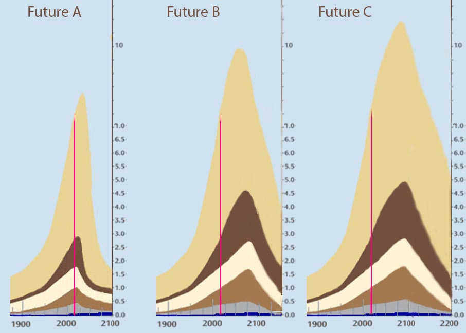 Other futures are possible, but probable futures are likely to fall between Future A and C. Descent is foreseeable. The exact point (to the year) of peak growth is not. From the point of view of geological time or even history, the difference between A and C is distinguishable only using a magnifying glass. What we are living in is a blip.
