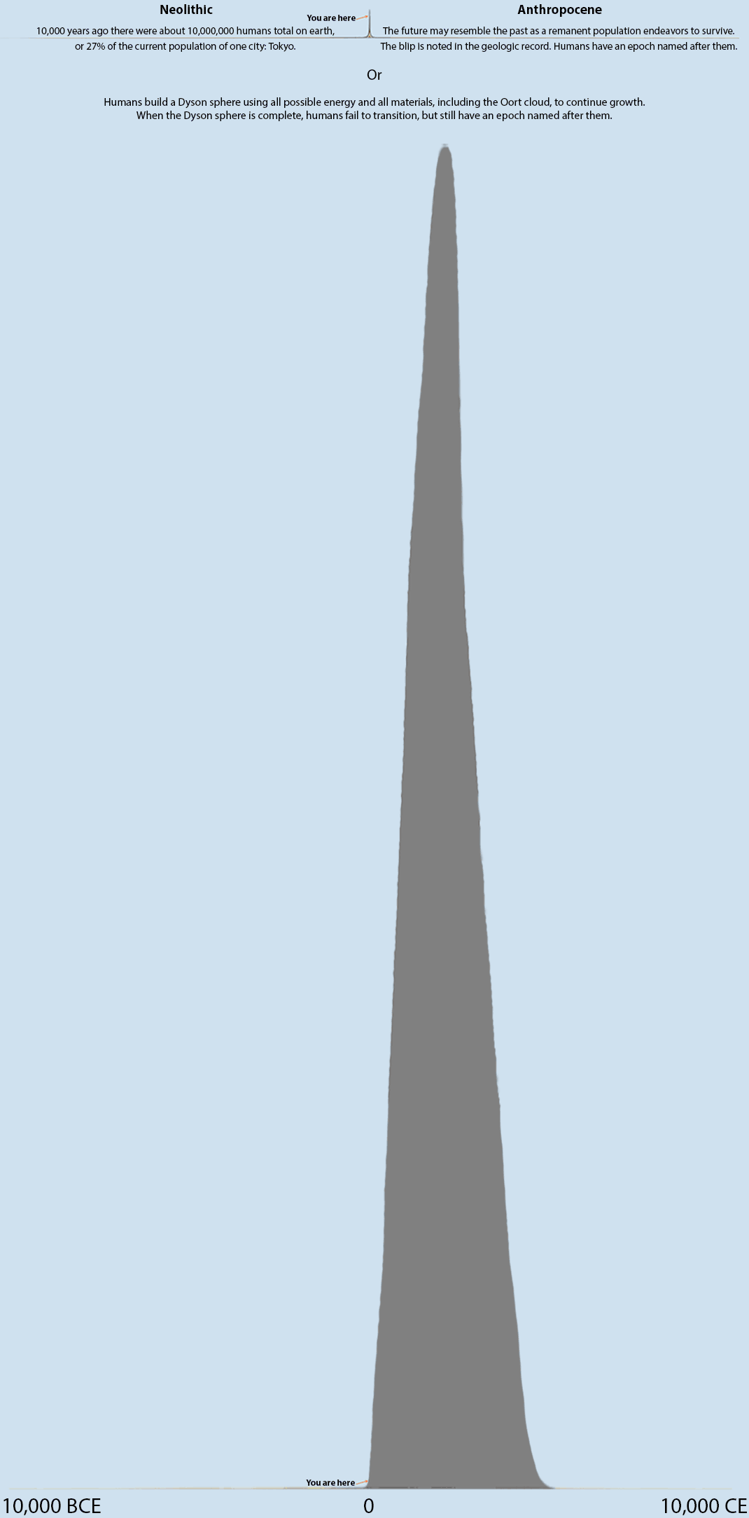 The first blip assumes human population maxes at 10 billion. The second maxes at about 30,000,000 trillion on a well designed Dyson sphere. If shown at the same vertical scale, the height of the peak would be about 3,000,000 trillion times higher, about 40,000 miles higher than shown. Humans may be smart enough to build a Dyson sphere, yet not smart enough to live sustainably on it. Assume the Dyson sphere contains trillions of civilizations, each with a population many times bigger than Earth's 21st century population. When complete, if any one of these civilizations continued to grow by consuming nearby civilizations (see last 6,000 years of human history), growing at their expense, just as a cancer cell grows at the expense of surrounding cells, then the resulting cancerous growth would have the same outcome. Be not a cancer on the earth or solar system. The ecolate life is alternative (e.g. Kogi).