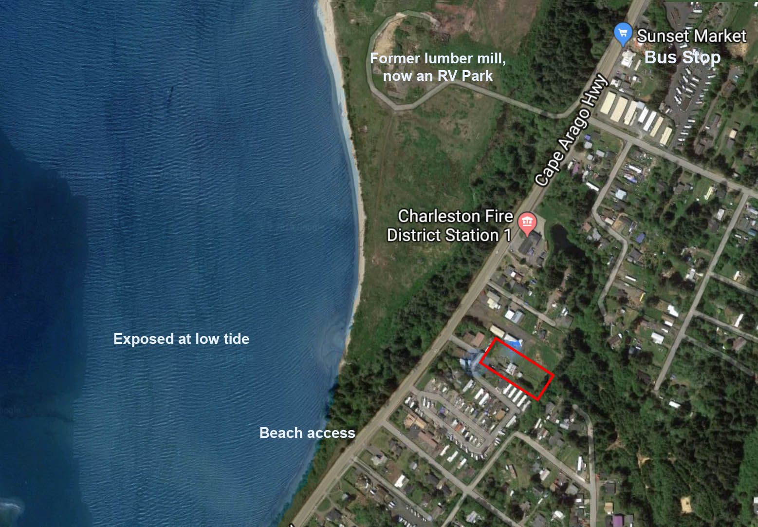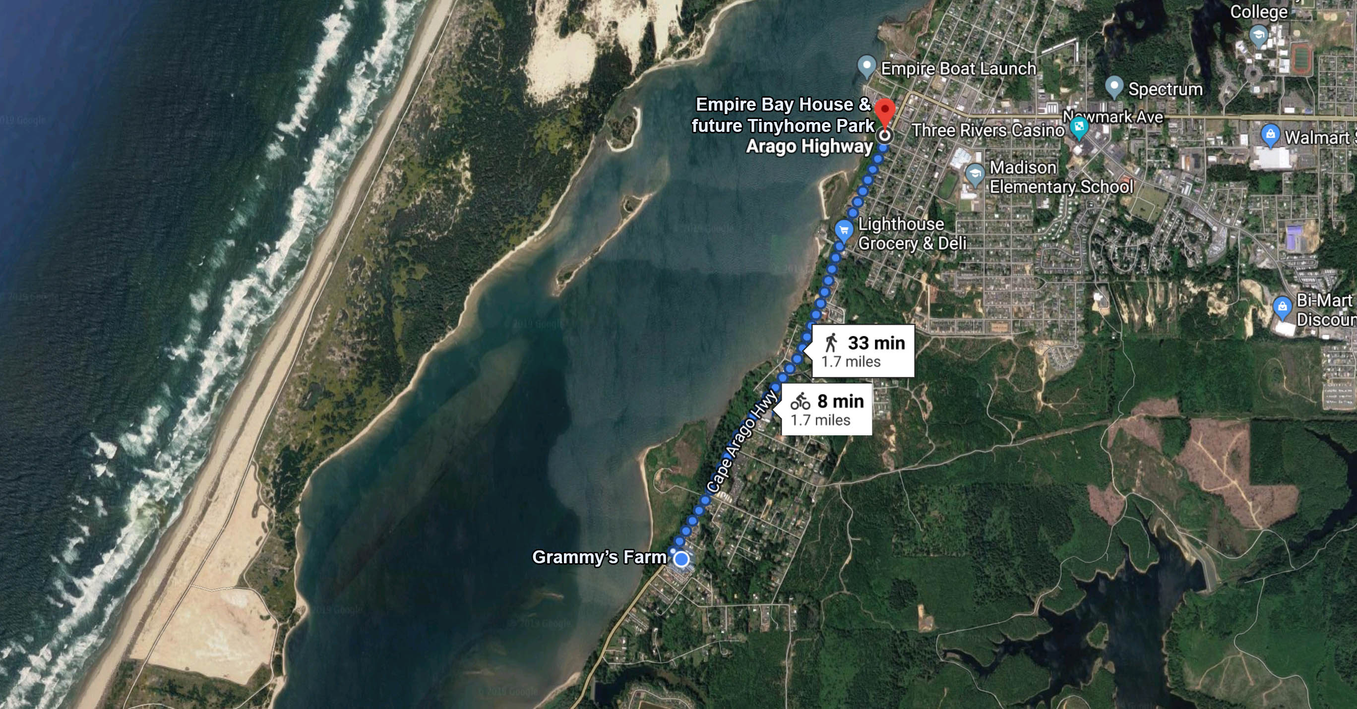 The big overview of area, showing the Bay House/future Empire Tinyhome Park. On a quite day, you can hear the surf's tormented roar, and it is a 20 minute kayak paddle to go to the North Spit. Over a hundred harbor seals haul out on the other side.