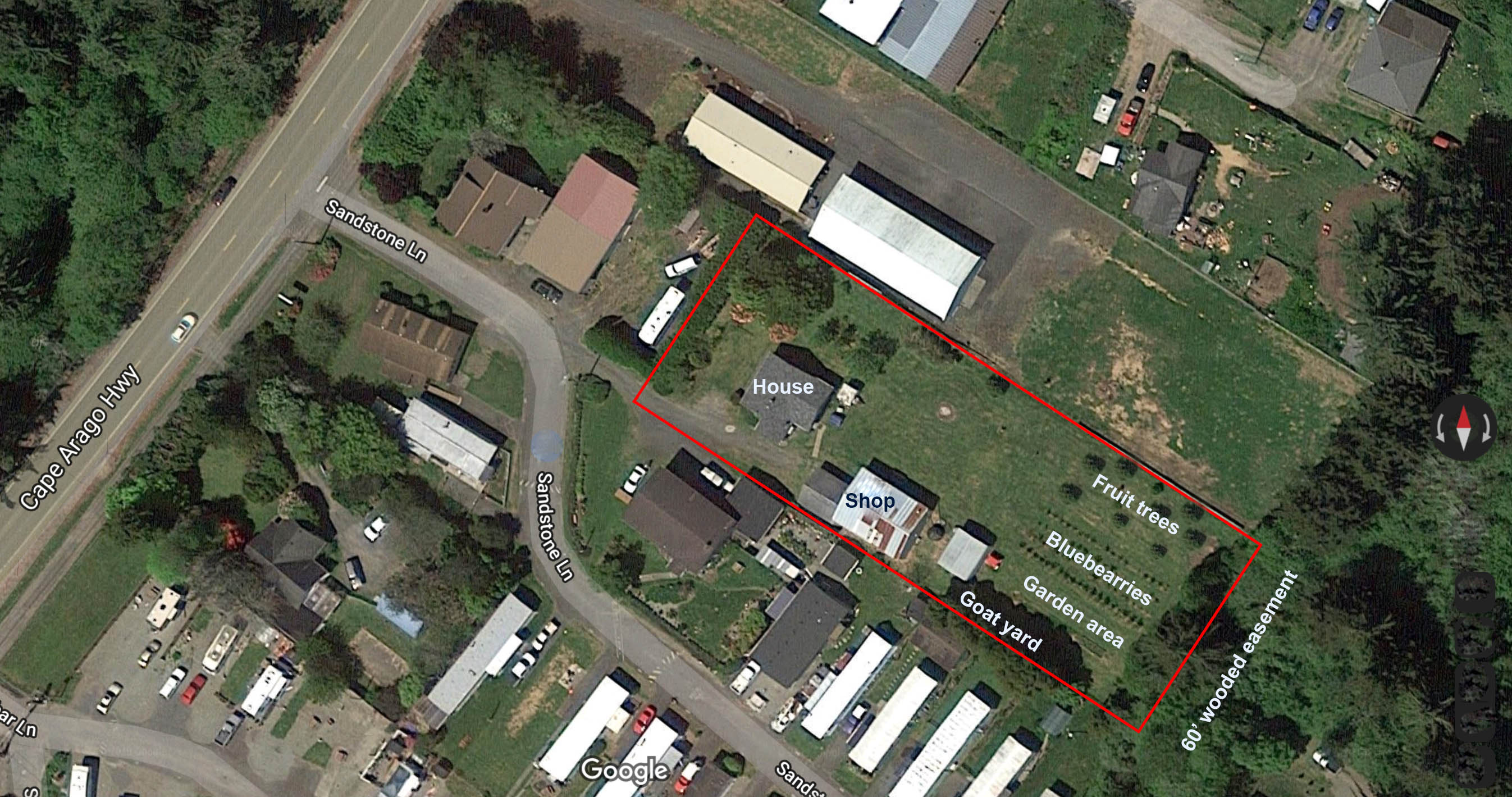 A small (big enough) two bedroom, two bath 966 sq. ft. house, stick built in 1948 in Empire part Coos Bay on commercial property (100 x 338 ft, 0.88 acre) with shop (SolTech Designs). The property is "Grammy's Farm" that includes the transitional urban micro-farmhouse, with areas for humans, plants (greenhouse, planters, trellis, garden) and small stock (rabbits, Guinea pigs, chickens, ducks, Nigerian dwarf milk goats) as permitted on commercially zoned property. A city bus stop is about 500 meters away (0.3 miles) at Sunset Market providing access to the big city for those without a car that stops at the neighborhood market.