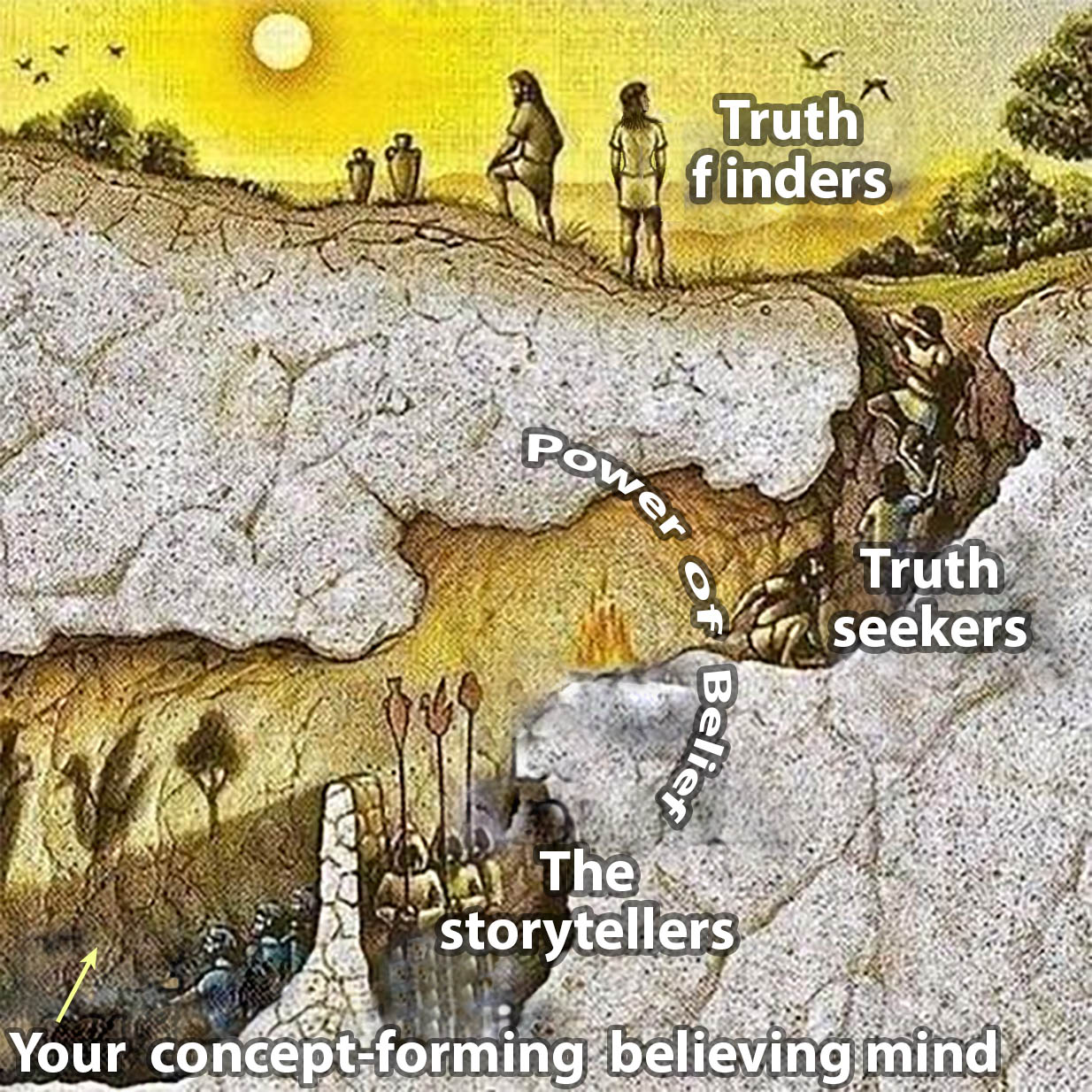 Inside the caves where fools [see below] reside, believing themselves wise, they believe they are merely an animal [dysfunctional] on an insignificant speck of cosmic dust in an infinite fantasy world brought to life by cartoons and NASA/Disney/Hollywood false images. They are forced to eat worms [e.g. putative facts believed by those whose 'worm does not die'] and wander around in darkness not able to understand their environment and having to imagine something that doesn’t exist instead.