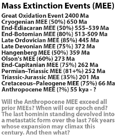 "There have been seven [climate change] disasters since humans came on the earth, very similar to the one that's just about to happen. I think these events keep separating the wheat from the chaff. And eventually we'll have a human on the planet that really does understand it and can live with it properly. That's the source of my optimism." James Lovelock who envisions an 80% to 90% die-off event this century.